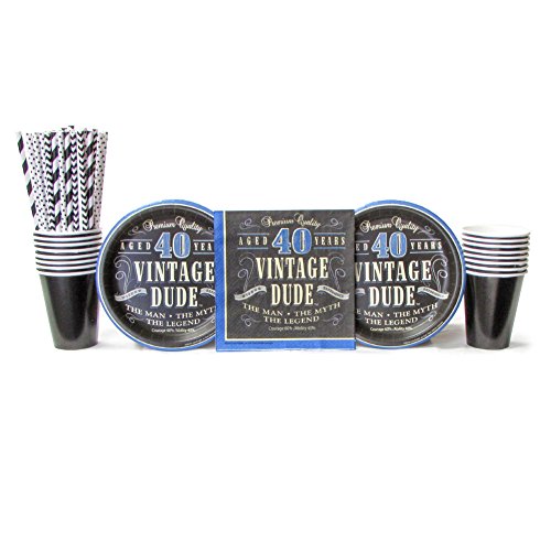 - Vintage Dude 40th Party Supplies Pack includes: Straws, Dessert Plates, Luncheon Napkins, and Cups.