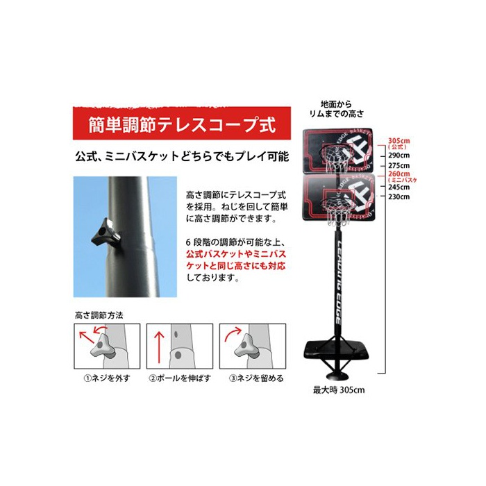 높이2.3?3.05m까지 조절 가능한 telescope식 폴을 채용,6단계의 높이 조절이 가능한 상,일반적인 농구부터 미니 농구와 같은 높이까지 폭넓은 높이로 대응합니다.