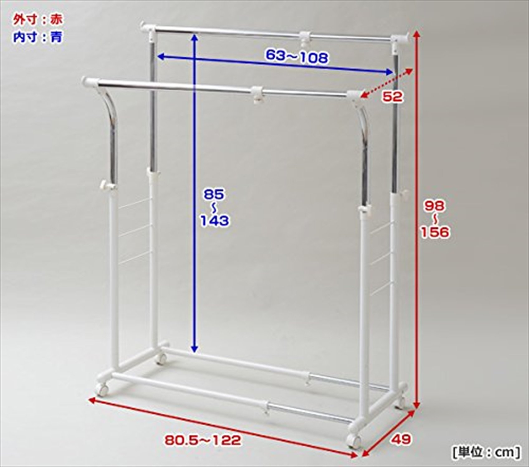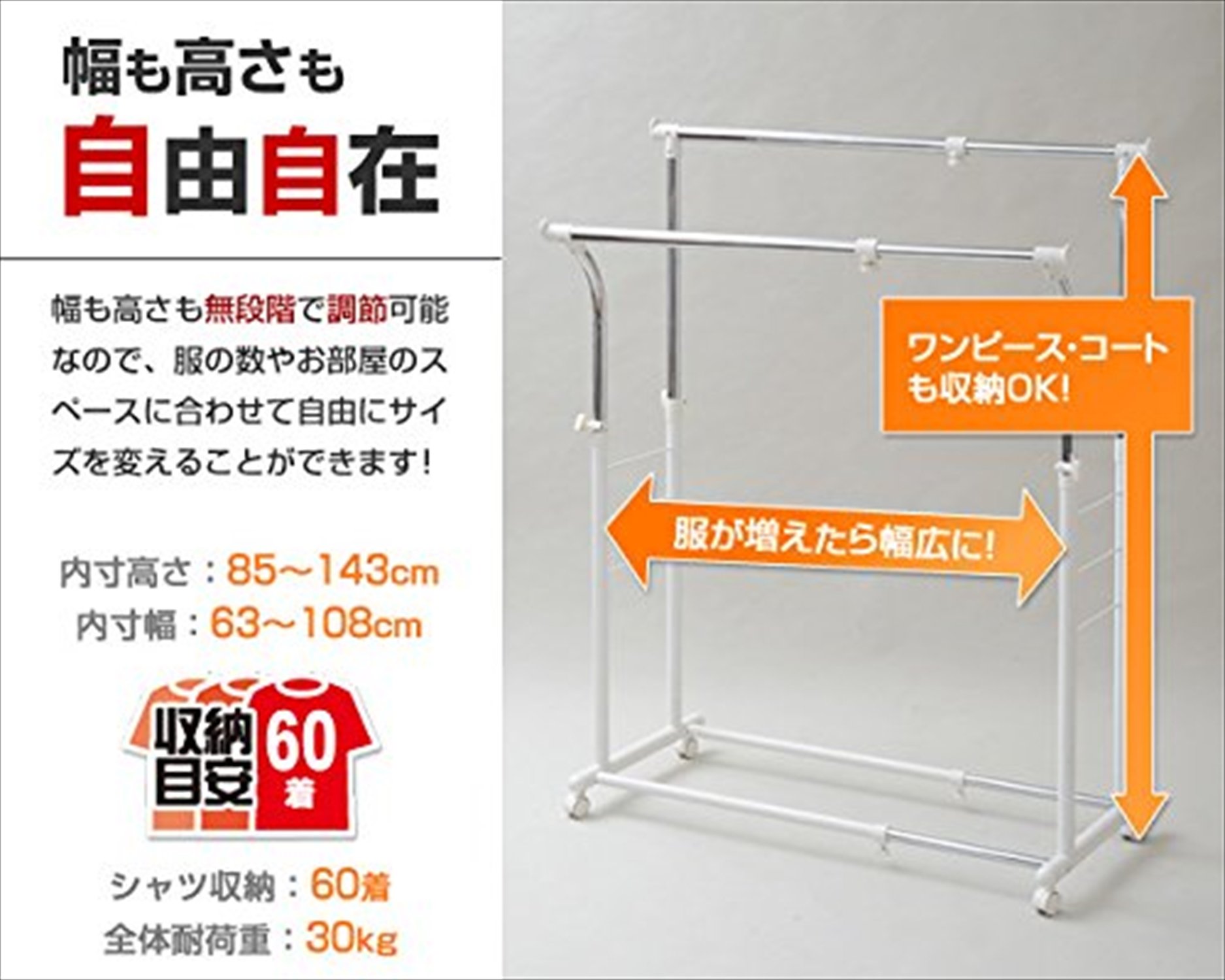 Maximum interior height 143 cm, can hold long piece dress and coat ● Shirt storage standard: 60 clothes ● Overall load capacity: 30 kg ● Hanger bar interior dimensions: width 63-108 height 85-143 cm ● with casters