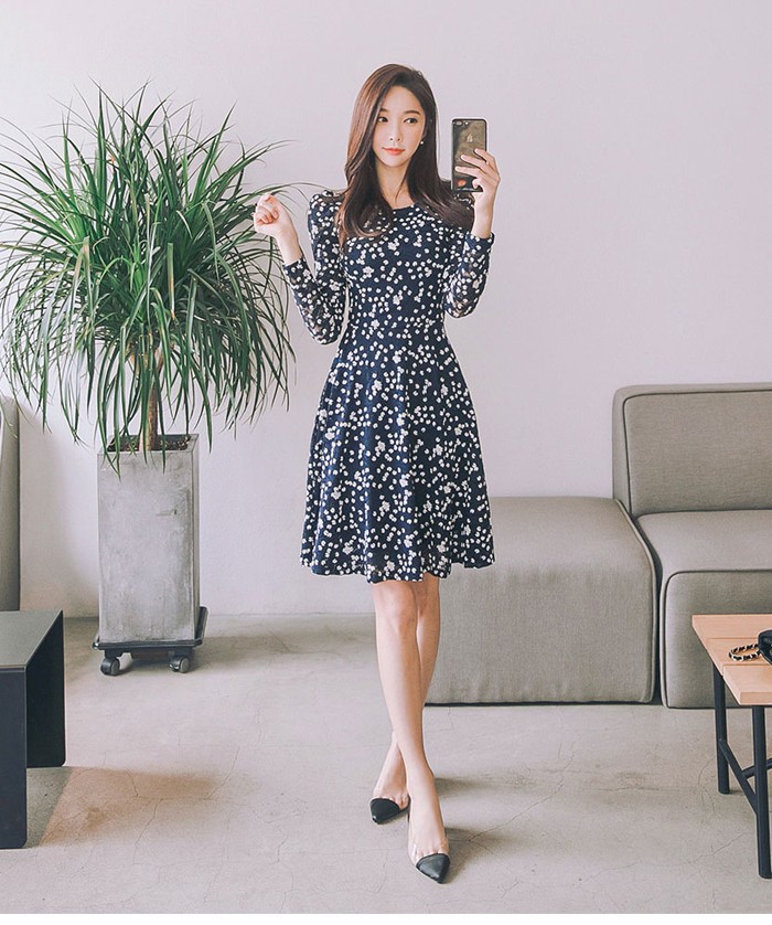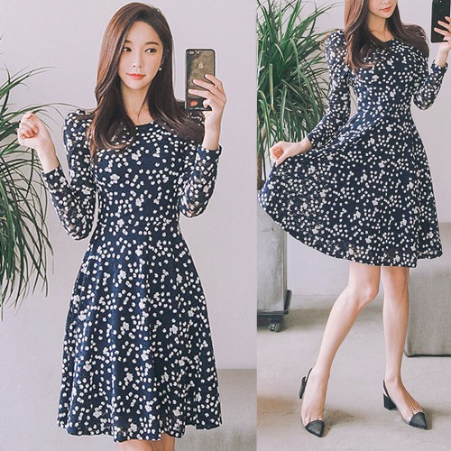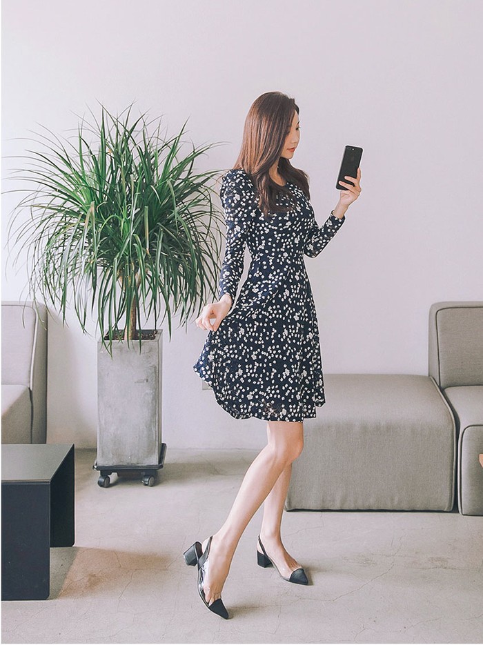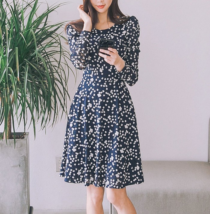 商品名:ワンピース Aラインワンピース 膝丈 長袖 きれいめ 花柄 フラワー