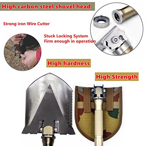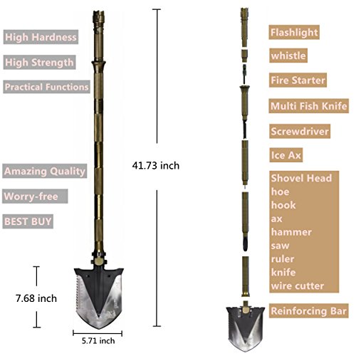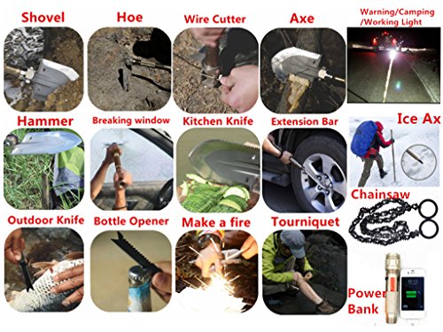 >> Shovel Function Summary--Foldable Shovel head, with functions of rule, axe, saw, hoe, hammer, kitchen knife, screwdriver, wire cutter etc;Multifunction knife, with functions of cut, bottle opener, can opener, saw, take off the hook when fish, etc;Hollow tube with high quality rings, the body could also be used as waterproof container.