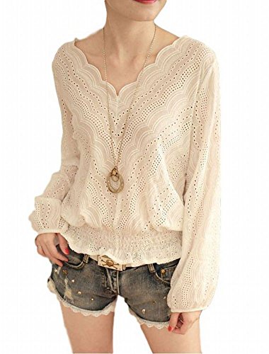 -. Title : (ヴォンヴァーグ) ventvague 長袖 Vネック スカラップ パンチング レース 刺繍 ブラウス トップス レディース