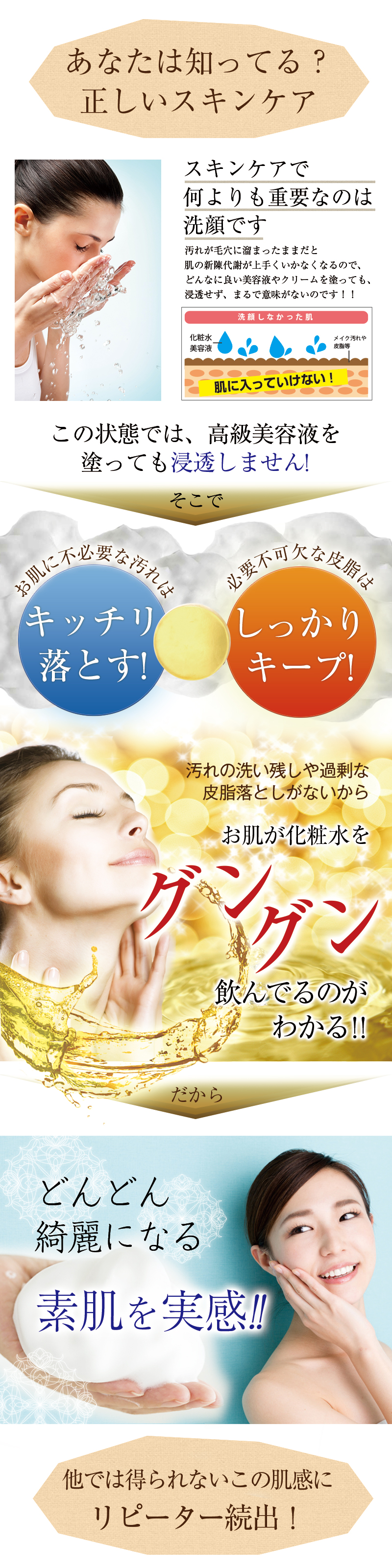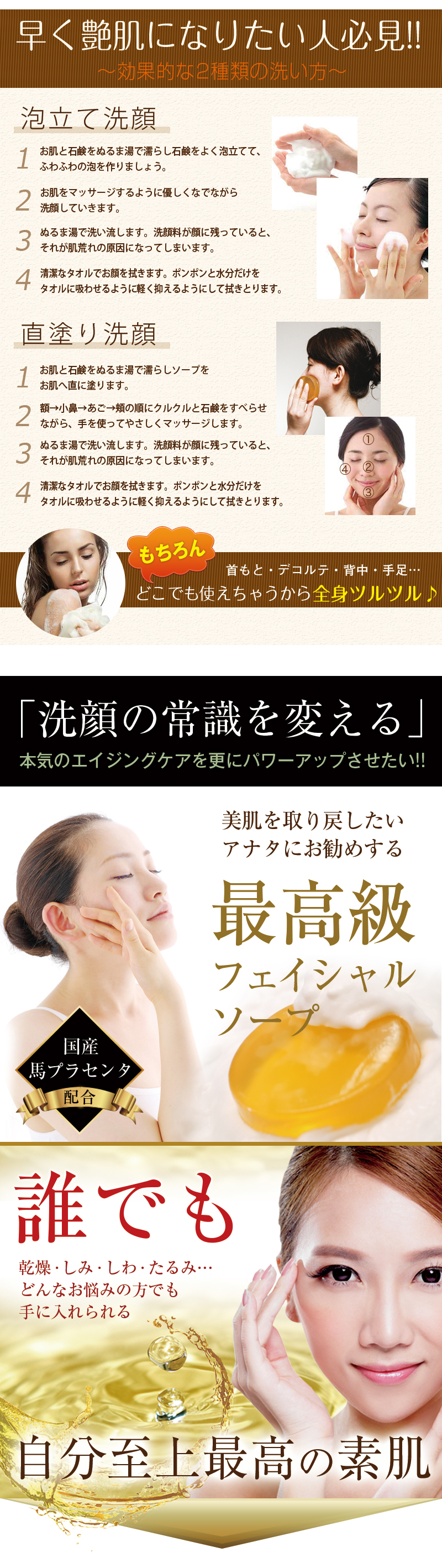| 使用方法 | お顔全体をぬらしてから、手のひらでたっぷり泡立てます。 泡でお顔全体を包み込むようにやさしく洗い、十分に洗い流してください。 |