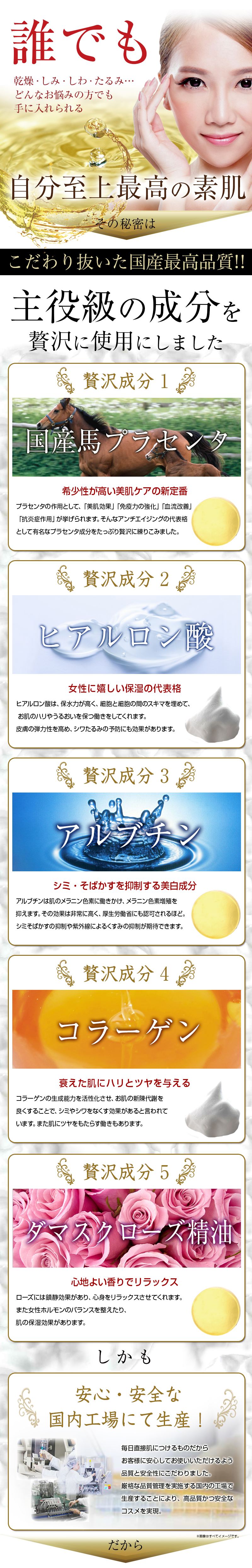| 特長 | 石けん素地に国産のダマスクローズオイルやローズエキスの他、※プラセンタエキスや ※ヒアルロン酸、※天然植物エキスを配合しております。(※保湿成分) |