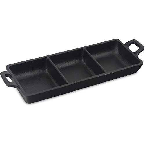 Studio : Jim Beam Publisher : Jim Beam Product Description The Jim Beam 11" Cast Iron 3-compartment pan is a great addition to a party or a get together. Serve 3 of your favorite condiments in this niche and classy item. Ideal for Grill and Oven. Heavy Duty Construction. Superior Heat Retention and Even Cooking. Measures 11"L x 3.75"W x 1.25"H. 0