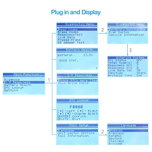 -. Feature : isYoung scanner is well built with a large LCD display (128 x 64 pixel) indicates test results directly. No need any Batteries or Charger, and gets the power directly from the OBDII Data Link Connector in your vehicle. / Works on most 1996 US-Based, 2000 EU-Based and Asian cars, and newer OBD II & CAN domestic or import vehicles. isYoung OBD scan tool read and clear stored emission-related codes and pending codes and show the definition of the codes; Check and turn off the engine light (MIL); Read Vehicle information including VIN, CID and CVN; Displays live data stream, real time trouble code Lookup library, EVAP, O2 sensor test and I/M readiness. / I/M READINESS HOT KEY: I/M Readiness test allow you to know clearly whether your car meet the smoke emission test standard, which legislated by the government to meet federal clean-air standards. Make sure you get fully prepared before you go to emission inspection station and get passed. / Uniquely featured with Battery Health Check function, clearly indicate your vehicle battery power and health status, all battery knowledge you need to know about. / Multi-language and Professional Service: isYoung built-in English, German, French, Spanish, Italian, Russian Portuguese and Finnish, etc. One Year Warranty and lifetime free software online update. Professional service team for your any questions.