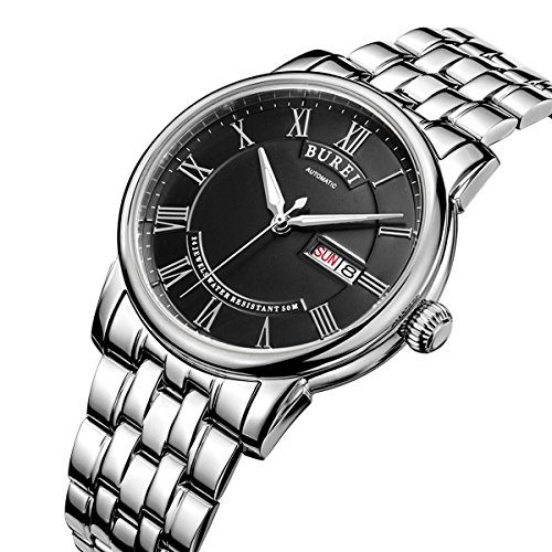 -. Title : BUREI Men's Automatic Watch with Day and Date Black Dial Metal Band