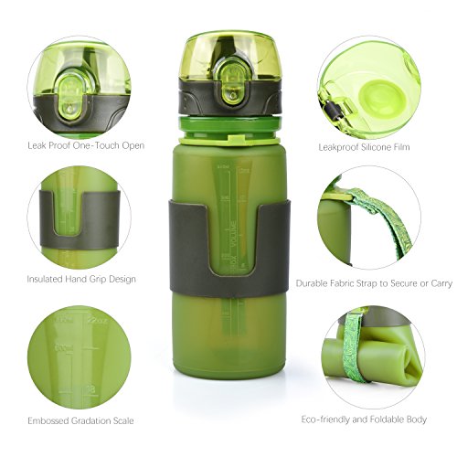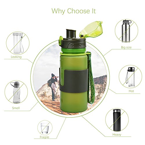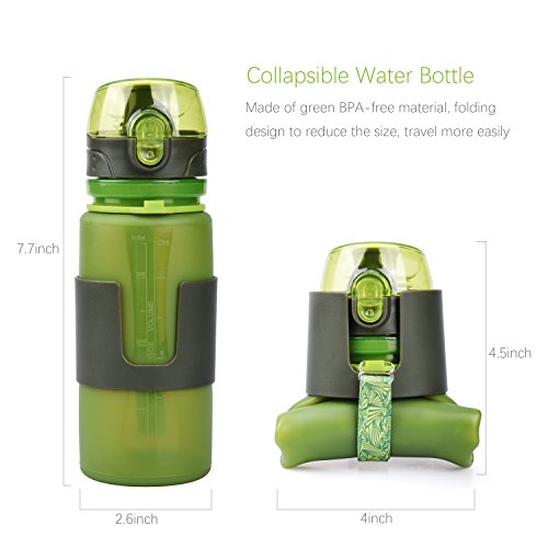 Collapsible Water Bottle: Water bottle design with flexible platinum BPA Free silicone material, When you roll it up empty, saving backpack space and lightweight,it is relatively compact for travel and luggage.