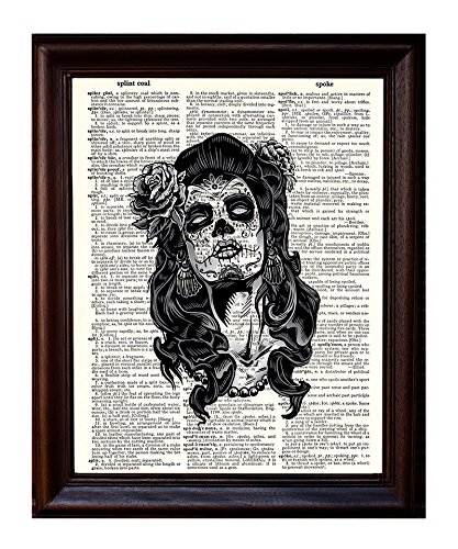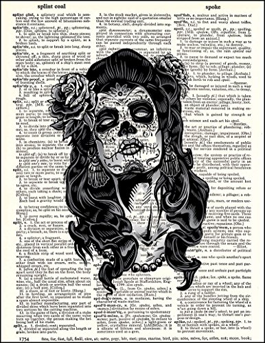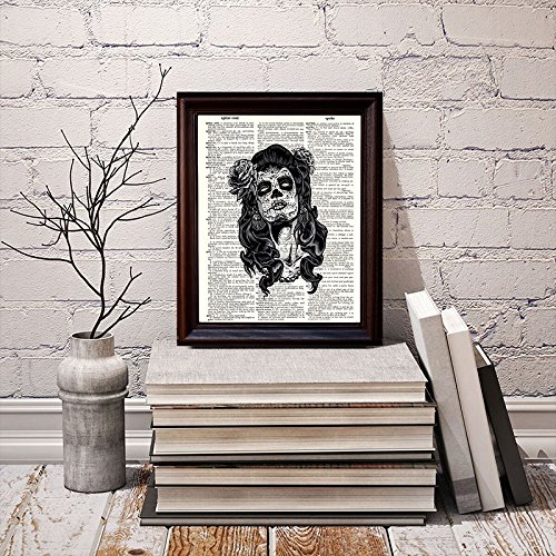 This Day of the Dead girl design is printed on beautiful vintage dictionary paper. These prints are definitely a conversation starter and look fabulous as a wall hanging. Each design is carefully selected and then printed on vintage dictionary paper giving it that beautiful golden color that only comes from age. Since we use real book pages some unevenness or spotting occurs, this only adds another layer to the print, making each one truly unique. Dimensions are approximately 8" W x 10.5" L. *** Frames are not included.***Feature