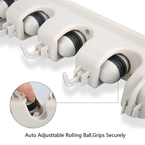 - MULTIPLE USE DESIGN - Our broom holder with 5 ball slots and 6 hooks.You can easily place garden, garage,kitchen and cleaning utilities on it.The hooks can be retractable while not using, it also can be stretched for storing many small stuffs, such as keys,brushes,towels,bathrobes or even oven mitts and umbrellas.