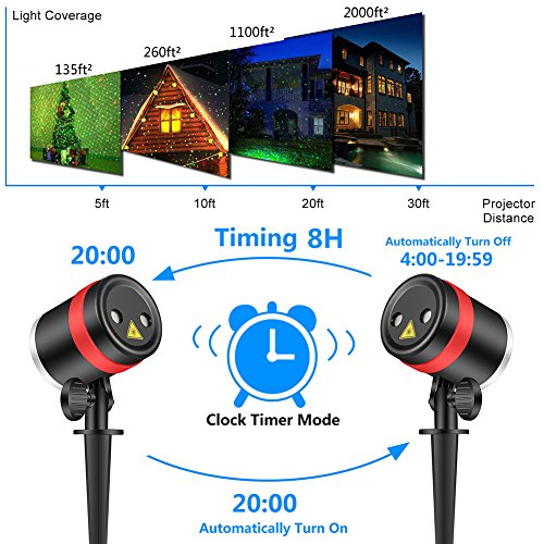 AUTOMATIC TIMER: Built-in timer function. You can set this laser light on at dusk and off at dawn. Use the remote control to set the timer as required. The light will turn on the same time every day or night and turn off again either 2, 4, 6, or 8 hours later.