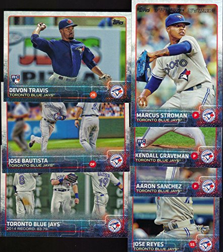 This is a Toronto Blue Jays 2015 Topps Baseball Regular Issue complete mint 25 card team set; it was never issued in factory form. All Blue Jays cards from series #1 and #2 including Russell Martin, Roberto Osuna, Ryan Goins, Mark Buehrle, Marco Estrada, Drew Hutchison, Devon Travis, Justin Smoak, Brett Cecil, Maicer Izturis, Michael Saunders, Aaron Loup, Jose Reyes, Aaron Sanchez, R.A. Dickey, Edwin Encarnacion, Dioner Navarro, Dalton Pompey, Dergio Santos, Marcus Stroman, Jose Bautista, Kendall Graveman, Daniel Norris, Brett Lawrie and a 2014 Blue Jays Team Standings card.