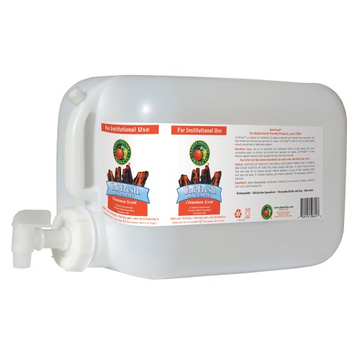 The Earth Friendly Products Proline PL9641/05U cinnamon UniFresh air neutralizer and freshener helps neutralize airborne household odors, and is made with biodegradable, plant-based ingredients such as cinnamon essential oil, using a pH-balanced formula that reduces risk of damage to fabric. It comes in a five-gallon plastic deltangular container with a vent and a spigot for smooth pouring from a shelf without having to lift the container when filling a dispenser (sold separately). This spray is ready to use, with no water source or dilution ratio measurement required. This product is safe for greywater and septic systems.