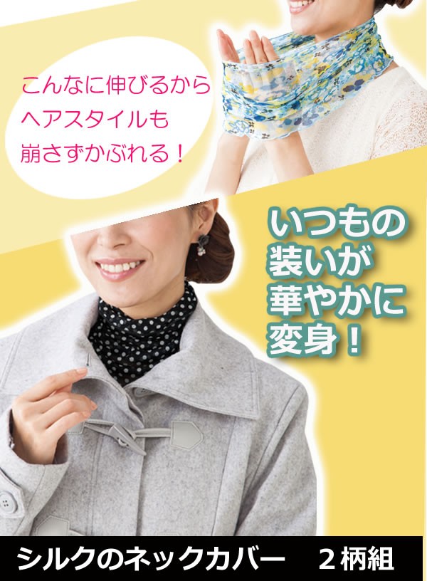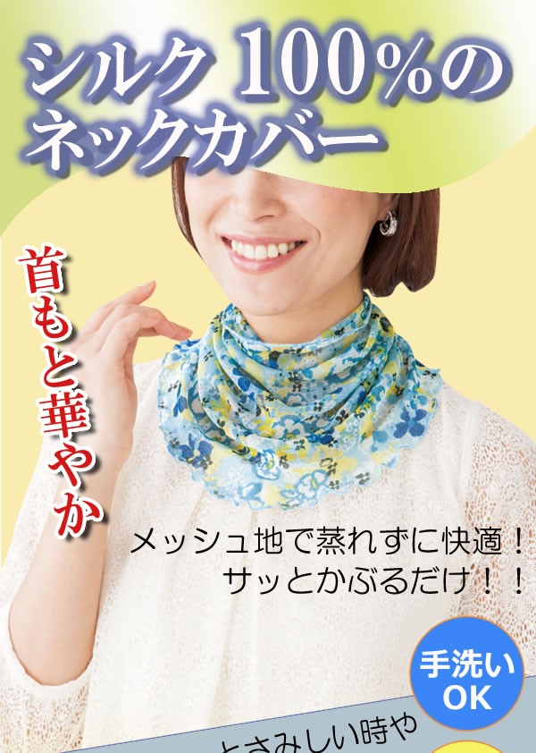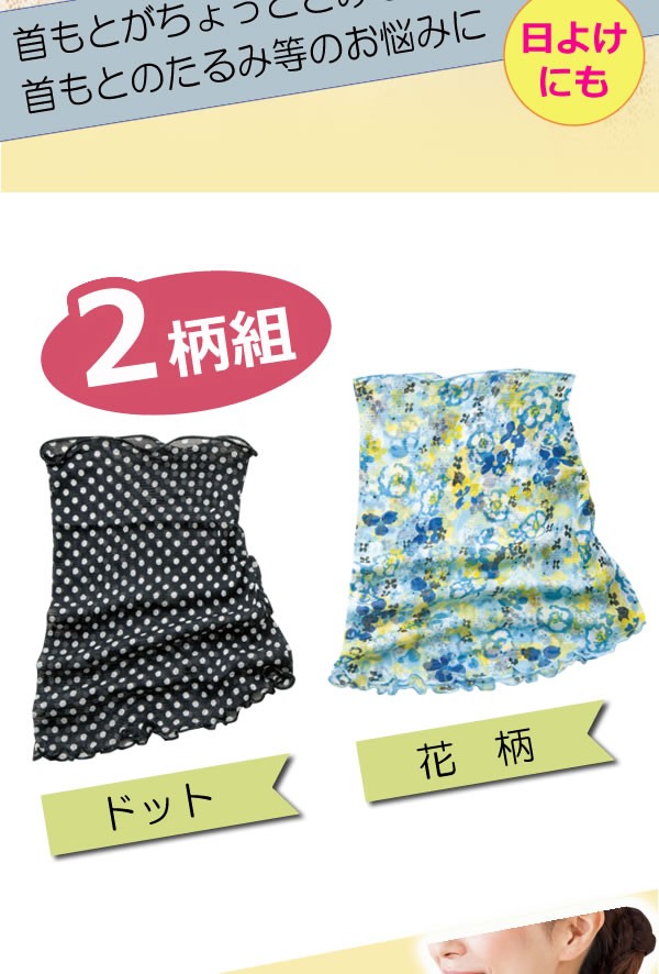 | <h1>肌触りがいいシルク100%のネックカバーで首もと華やかに!肌にやさしいやわらか生地。メッシュ地で蒸れずに快適!首もとがちょっとさみしい時の装いをおしゃれに変身!首もとのたるみ等のお悩み、クーラーなどの冷え対策、UV・紫外線対策、日よけにも使える!かわいいドットと花柄の2柄組!手洗いできるから清潔を保てます。母の日のプレゼント、ギフトとしても◎</h1> |