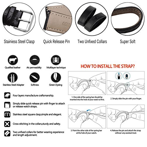 -. Binding : Watch -. Brand : Green Olive -. Department : Unisex-adult -. Feature : Strap Length: 125mm+75mm(without Buckle) 丨Thickness: 3-5mm丨Band Width:20mm丨Buckle Width:18mm / TOP COMFORT: Use top grain leather and 316 stainless steel buckle. Refined, Durable, and Comfortable. Provide two unfixed collars to prevent falling off. / EASY INSTALLATION: Quick Release design makes it fast and simple to install and change your band in seconds. While most people can do this with just their finger we also include an assistant tool to meet your needs. / NOTE:The band might be a little bit stiff when first used. Bend it forth and back for several times or wear it for a few days, it will become quite soft and comfortable to wear. / PURCHASE OF SECURITY: We guarantee a 100% refund if you are not satisfied with the products you received within 30 days and we provide 12 month warranty, If anything is wrong - please feel free to contact us - we will make it right. -. Label : GreenOlive -. Manufacturer : GreenOlive -. MPN : GreenOlive -. PartNumber : GreenOlive -. ProductGroup : Watch -. ProductTypeName : WATCH -. Publisher : GreenOlive -. Studio : GreenOlive -. Title : Quick Release Genuine Leather Watch Band Strap with Stainless Metal Clasp