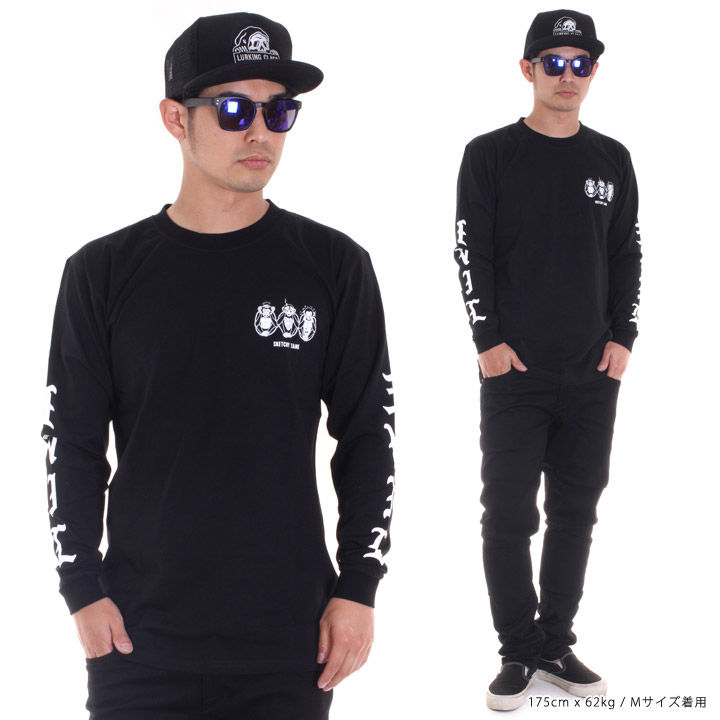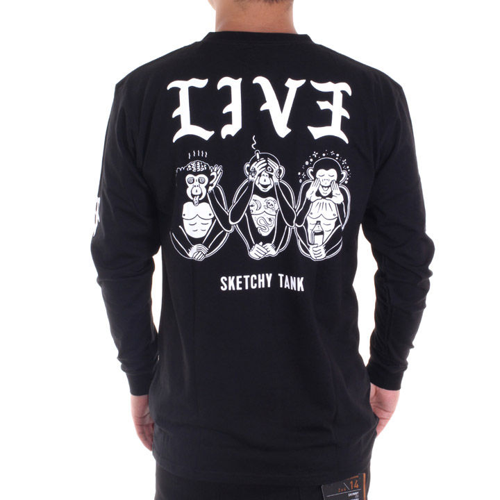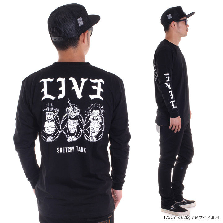 "SKETCHY TANK / スケッチータンク"の遊び心が効いた日本限定イラストのロンTです。見ざる、聞かざる、言わざるを独特の世界観で描いた印象的なイラストに、"LIVE=生きる"と反対から読んで"EVIL=邪悪、凶暴"をかけたこだわりの作品。一枚でももちろん、レイヤードアイテムとしても使える万能な一枚◎スケッチー好きにも、知らない人にもわかりやすいキャッチーさが好印象です。