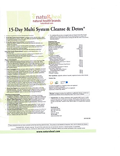 -. Binding : Health and Beauty -. Brand : natuRxheal -. EAN : 0039517212569 -. Feature : combines various minerals, herbs, antioxidants, glutathione precursors, amino acids, DMG and 3 patented ingredients known to support bioavailability and liver health. / people searching for support for normal toxin cleansing and individuals on a weight-loss program / people exposed to chemical solvents (painters, dry cleaners, construction workers, printers, office workers, auto mechanics, manicurists, and beauticians) / people who experience continuing fatigue / people undergoing sauna therapy and people with chemical sensitivities -. Label : natuRxheal -. Manufacturer : natuRxheal -. PackageQuantity : 1 -. ProductGroup : Health and Beauty -. ProductTypeName : HEALTH_PERSONAL_CARE -. Publisher : natuRxheal -. Studio : natuRxheal -. Title : 15 day Multi System Cleanse & Detox -. UPC : 039517212569