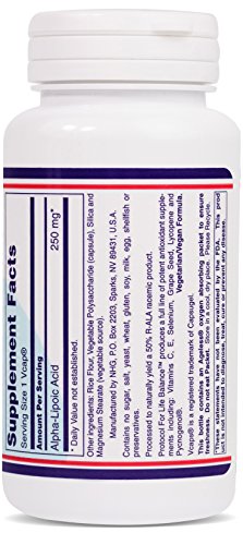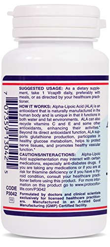 BENEFITS: Alpha-Lipoic Acid (ALA) is an antioxidant that is naturally manufactured in the human body. ALA has been called the "universal antioxidant" because of its versatility-it helps deactivate an unusually wide array of cell-damaging free radicals in both water and fat environments. ALA works in conjunction with vitamins C and E and some other antioxidants, "recycling" them and making them much more effective. Beyond its direct antioxidant function, ALA helps to boost glutathione levels. Glutathione possesses its own antioxidant activities and is a critical component in cellular and hepatic detoxification mechanisms. ALA is also necessary for healthy glucose uptake and utilization, thereby helping to support healthy carbohydrate metabolism. In addition, because alpha-lipoic acid can pass easily into the brain, it has protective effects on brain and nerve tissue.*Protocol For Life Balance® is an A-rated GMP manufacturer of pharmaceutical grade dietary supplements created for healthcare practitioners. Our product line is comprised of effective, science-based formulations intended to address common nutrient deficiencies and support healthy physiological function. These formulations are based on the latest advances in nutritional science and incorporate trademarked ingredients of the highest quality. Our serving sizes are based on doses used in clinical trials and other published data, and the ingredients used in our products have been tested for efficacy in clinical trials and laboratory studies.