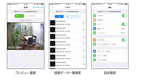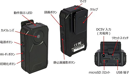 -. Feature : Wi-Fi機能搭載:専用アプリをインストールしたスマートフォンやタブレットからWi-Fi接続が可能です。 撮影画面の確認や録画のオンオフのコントロール、解像度やフレームレート、日時設定などさまざまな設定ができます。 また、録画データをダウンロードできます。 / 1080pの記録解像度:記録解像度は1920×1080を提供。高画質で鮮明な動画を記録できます。 / 4時間超の電池寿命:電池寿命は連続駆動4時間以上を実現しています。長時間の撮影時も安心です。 / クリップマウントの提供:付属のクリップマウントは回転可能でベルトやリュックへ簡単に装着できます。 クリップが不要の場合は取り外してご使用いただけます。 / 映像機器は駆動中に熱を発します。電源を入れたまま長時間体に密着する様な使用はお止めください。