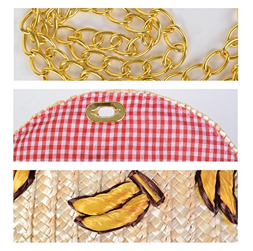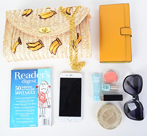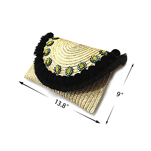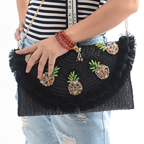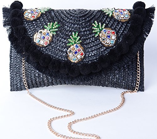 -. Brand : Pulama® -. Department : womens -. Feature : Demension:13.8"*1"*9" / Two colors available, Ivory shell with sun flower and Black with pinapple. / Outside made with straw and interior with cotton lining.Anchors under flap. / Adorable clutch or gorgeous crossbody,change with a long gold metal chain,drop 22". / The chic envelope bag allows daily work or vacation travel,give fresh and colorful summer.Fun and eye-catching. -. Model : FUDBG-50 -. ProductGroup : Shoes -. ProductTypeName : HANDBAG -. Size : Small -. Title : Pulama Straw Crossbody Crochet Shoulder Bag Pom Pom Tassel Pinapple Fringe Fashion Clutch