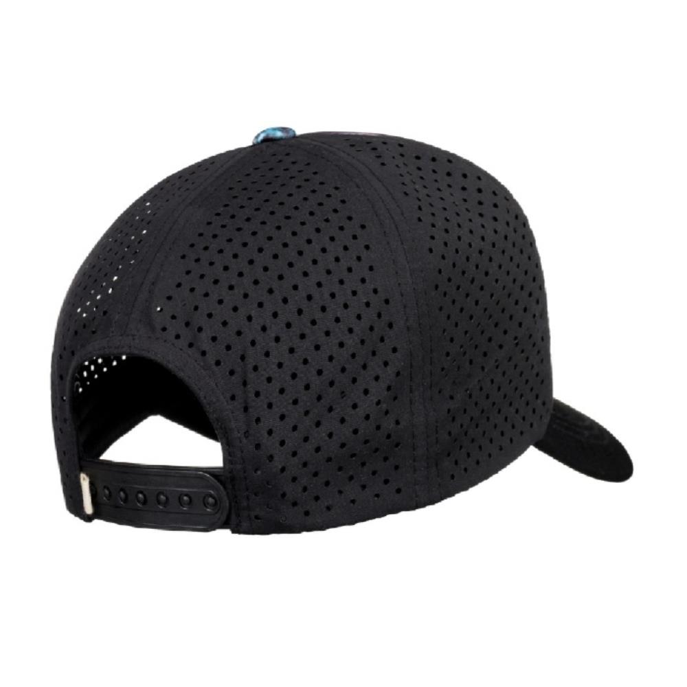 전면에는 프린트 소재, 뒷면에는 타공 원단이 매치된 트러커 캡 모자. 뒤에서 모자 둘레를 조절할 수 있다. | |