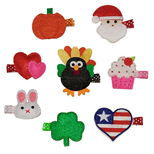 Studio : Tiny Expressions Publisher : Tiny Expressions Binding : Misc. Product Description Get your little girl in the holiday spirit with these adorable felt hair clips. Set comes with 8 hair barrettes so she'll be ready for Christmas, Thanksgiving, Halloween, Valentines, St. Patrick's Day, Easter, Fourth of July and a special Birthday celebration. Each felt clip features extraordinary details and have ribbon wrapped clips. Includes one of each: Santa clip, turkey clip, pumpkin clip, heart clip, shamrock clip, bunny clip, heart flag clip, and birthday cupcake clip. Dimensions of each clip vary. All clips are approximately 2 inches wide by 2 inches tall. Turkey clip is slightly larger (3 inches tall by 2 inches wide). 0