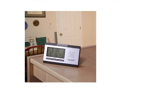 - Feature : Talking clock announces time and temp when pressed / Built-in alarm clock with snooze function / Displays and announces temperature in celsius and fahrenheit / Great for home or travel / Requires 2 "AAA" batteries (not included)