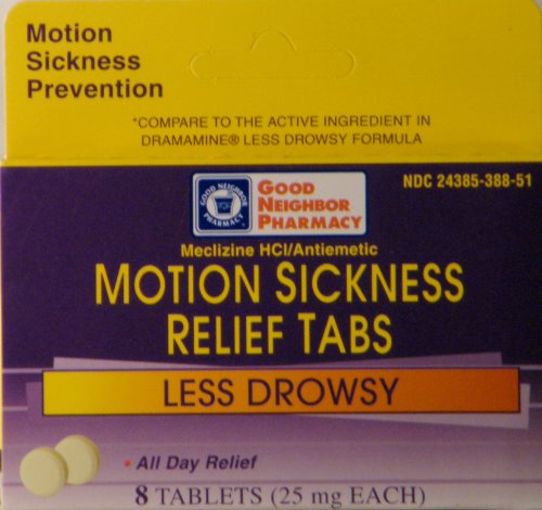 -. Binding : Health and Beauty -. Brand : Good Neighbor Pharmacy -. EAN : 0087701347429 -. Feature : All day relief / Less drowsy / Prevent dizziness and vomiting -. IsAdultProduct : 0 -. Label : Good Neighbor Pharmacy -. LegalDisclaimer : Disclaimer: While we work to ensure that product information is correct, on occasion manufacturers may alter their ingredient lists. Actual product packaging and materials may contain more and/or different information than that shown on our Web site. We recommend that you do not solely rely on the information presented and that you always read labels, warnings, and directions before using or consuming a product. For additional information about a product, please contact the manufacturer. Content on this site is for reference purposes and is not intended to substitute for advice given by a physician, pharmacist, or other licensed health-care professional. You should not use this information as self-diagnosis or for treating a health problem or disease. Contact your health-care provider immediately if you suspect that you have a medical problem. Information and statements regarding dietary supplements have not been evaluated by the Food and Drug Administration. -. Manufacturer : Good Neighbor Pharmacy -. ProductGroup : Health and Beauty -. ProductTypeName : HEALTH_PERSONAL_CARE -. Publisher : Good Neighbor Pharmacy -. Studio : Good Neighbor Pharmacy -. Title : GNP Motion Sickness Relief Tabs (8 tablets) -. UPC : 087701347429