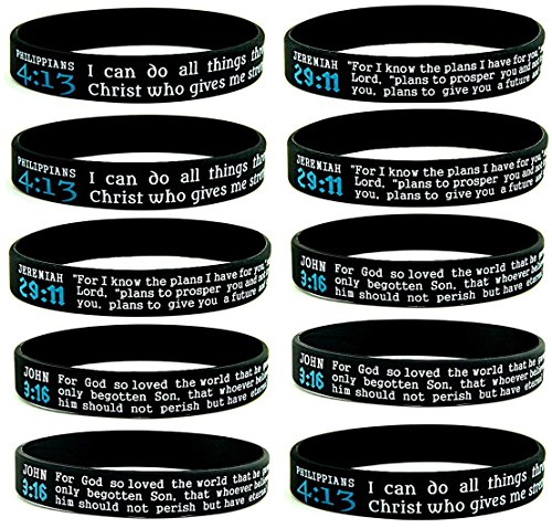(10-pack) Scripture Silicone Bracelets - Jeremiah 29:11, John 3:16, & Philippians 4:13 Assortment Bulk Pack - Christian Religious Bible Verses Silicone Rubber...