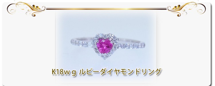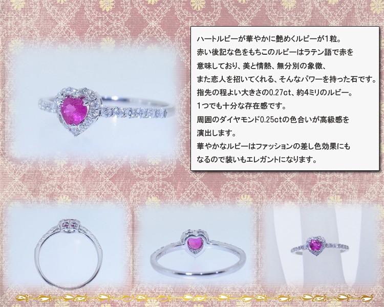 商品説明 ハートの0.27ctルビーの周りで0.25ct天然ダイヤモンドが共に輝くK18ホワイトゴールドの綺麗なリングです。
