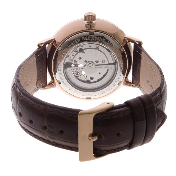 | サイズ | (約)H42×W42×D15mm(ラグ、リューズは除く)、重さ(約)61g、腕周り最大(約)18.5cm、最小(約)14.5cm | | 仕様 | ステンレス(ケース)、レザー(ベルト) 自動巻き、3気圧防水、スモールセコンド、カラー:ホワイト/ピンクゴールド(文字盤)、ブラウン(ベルト) 1年間 | | 付属品 | 専用BOX、保証書、取扱説明書 |