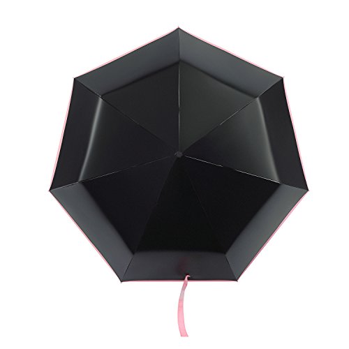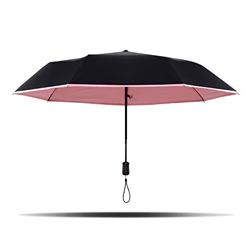 -. Feature : The outside black sun shade coating blocks strong sunlight and heat away from you, cool you down in the hot sun, UPF 50+ for the protection from UV rays / 190T Pongee waterproof fabric canopy, rainwater will cement in drops flip away, shake gently after closing the umbrella, the drops will gone / Lightweight aluminium alloy shaft and fiberglass ribs, and ribs screwed down by hook & loop fastener, pretty simple and sturdy / Auto open and close, easy device with one hand / 41 inch in canopy arc, the folding length only 11 inch, compact for easy carrying, fit in your handbag, backpack, small travel tote