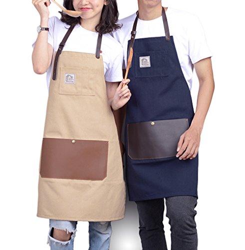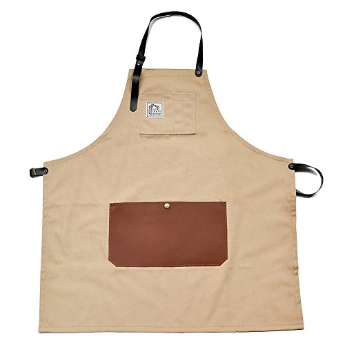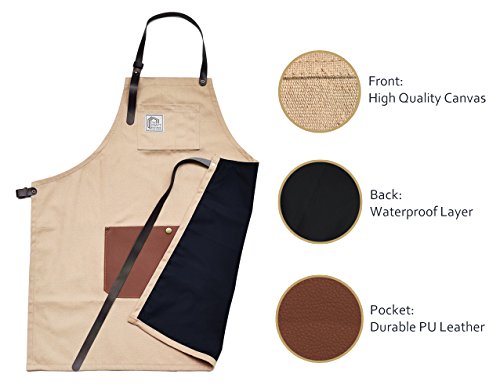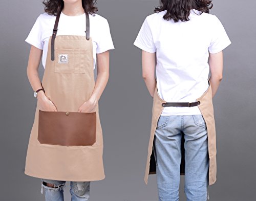 Aprons For Men And Women With Leather Pocket - Chef Kitchen Canvas Hairstylist Apron - Beige