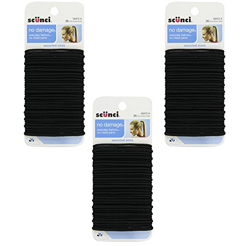 Studio : Scunci Publisher : Scunci Binding : Misc. Product Description Scunci effortless beauty no-damage black elastics are your secret to effortless all-day hold. slide into any situation without worrying about hair slippage. two thicknesses for better hold on different styles. soft metal-free elastic bands keep ponytails tight while working out or for casual style and won't damage your hair. easy to carry in purse or workout bag so you can change looks instantly. 3-Pack of 36 ensures that no matter where you put one down you'll always be able to pick one up. basic black - as essential as the little black dress. 0