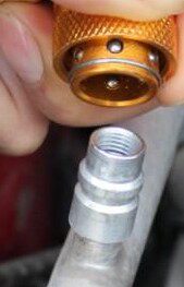 注:在没有刺穿制冷剂瓶时,DIY管中有一点空气,如果车主如要需要将管子中的一点空气排掉,请按以下方法做,在没有刺穿制冷剂瓶时将制冷剂瓶子和开瓶器轻轻松开一点,这时DIY管中的空气会被空调系统中制冷剂冲出去,这时即刻旋紧制冷剂瓶即可!!!