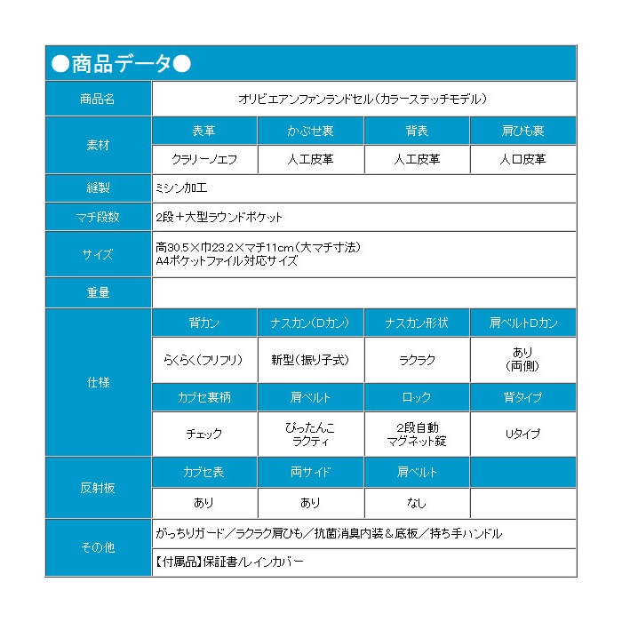 원본상품명: オリビエアンファン カラ?ステッチ ランドセル (?×ブル?ステッチ)クラリ?ノエフ艶消し A4フラットファイル??サイズ送料無料?れ筋