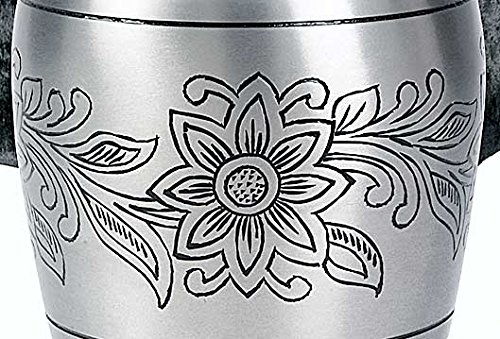 This genuine brass urn, the Pewter Bouquet has a brushed pewter finish. The carved floral designs are entirely hand engraved. Since it is skillfully carved by hand, no two urns are exactly alike. This makes each urn a unique work of art. The screw-on top is threaded and secure 0 |