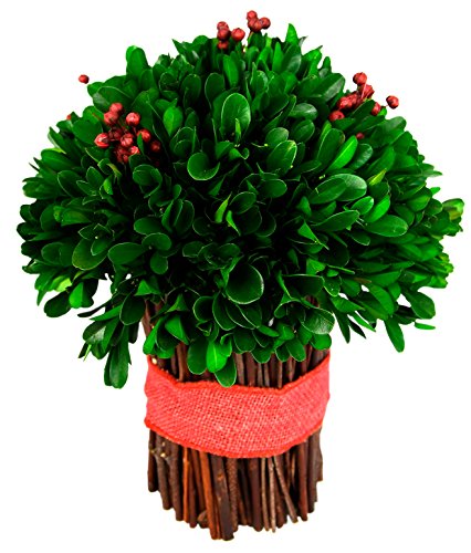 - Boxwood accented with berry-topped twigs, wrapped in a festive red ribbon; measures approximately 10-inches tall
