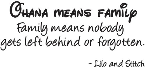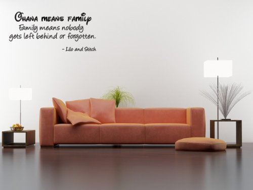 -. Binding : Kitchen -. Brand : WallDecalQuote -. Color : Black -. EAN : 0700358373473 -. Feature : Shipped from the USA - Made to Order From Premium Quality Material / Wall Decal Color: Black / Size: 28" Wide x 13" High / Self Adhesive wall decal and easy to setup - Made from 7 year High Quality Vinyl / Can be used on wall or any other smooth surface -. IsAutographed : 0 -. Label : WallDecalQuote -. Manufacturer : WallDecalQuote -. Model : 6078285 -. MPN : J496 -. PackageQuantity : 1 -. PartNumber : J496 -. ProductGroup : Home -. ProductTypeName : HOME -. Publisher : WallDecalQuote -. Size : 28" Wide x 13" High -. Studio : WallDecalQuote -. Title : Ohana means family Family means nobody gets left behind or forgotten wall quote wall decals wall decal wall sticker -. UPC : 700358373473
