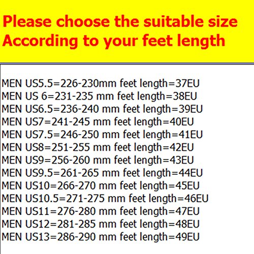 Binding : Apparel Product Description Note Please choose the suitable size according to your feet length MEN US5.5=226-230mm feet length=37EU MEN US 6=231-235 mm feet length=38EU MEN US6.5=236-240 mm feet length=39EU MEN US7=241-245 mm feet length=40EU MEN US7.5=246-250 mm feet length=41EU MEN US8=251-255 mm feet length=42EU MEN US9=256-260 mm feet length=43EU MEN US9.5=261-265 mm feet length=44EU MEN US10=266-270 mm feet length=45EU MEN US10.5=271-275 mm feet length=46EU MEN US11=276-280 mm feet length=47EU MEN US12=281-285 mm feet length=48EU MEN US13=286-290 mm feet length=49EU