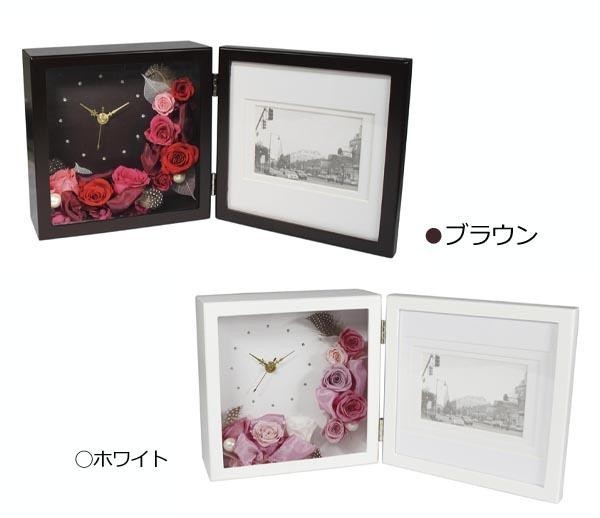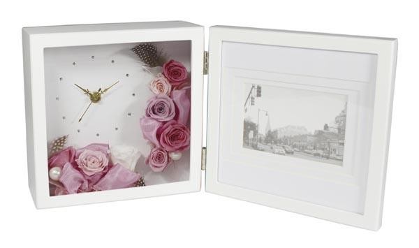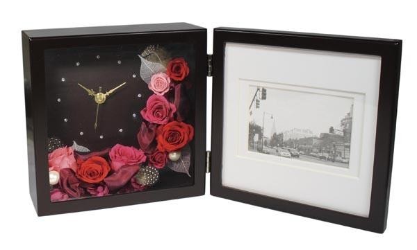 | 生花の風合いに近い状態で長期にわたり楽しめるプリザーブドフラワーを使用した時計付きピクチャーフレームです。写真部分にはL判(89×127mm)・2L判(127×178mm)・ポストカード(100×148mm)を縦横どちらでも入れられます。 |
