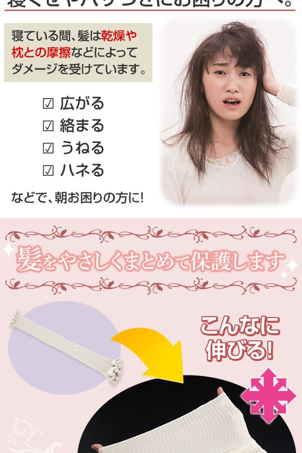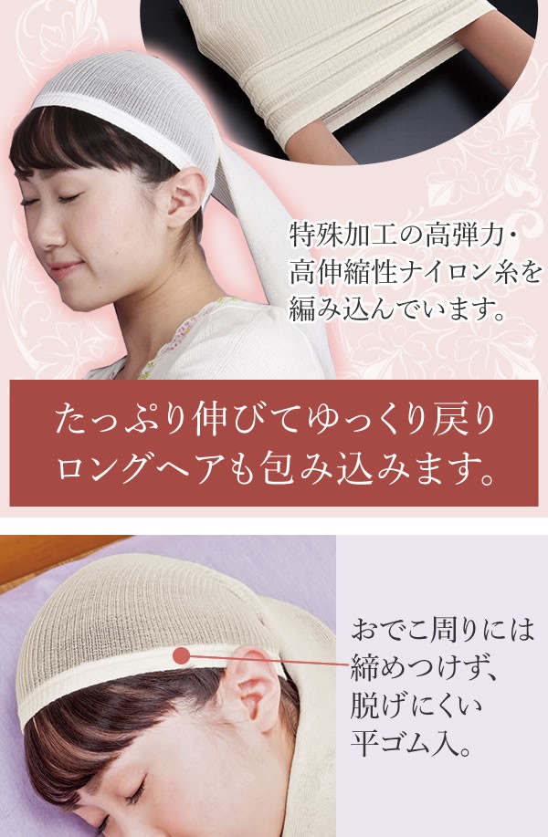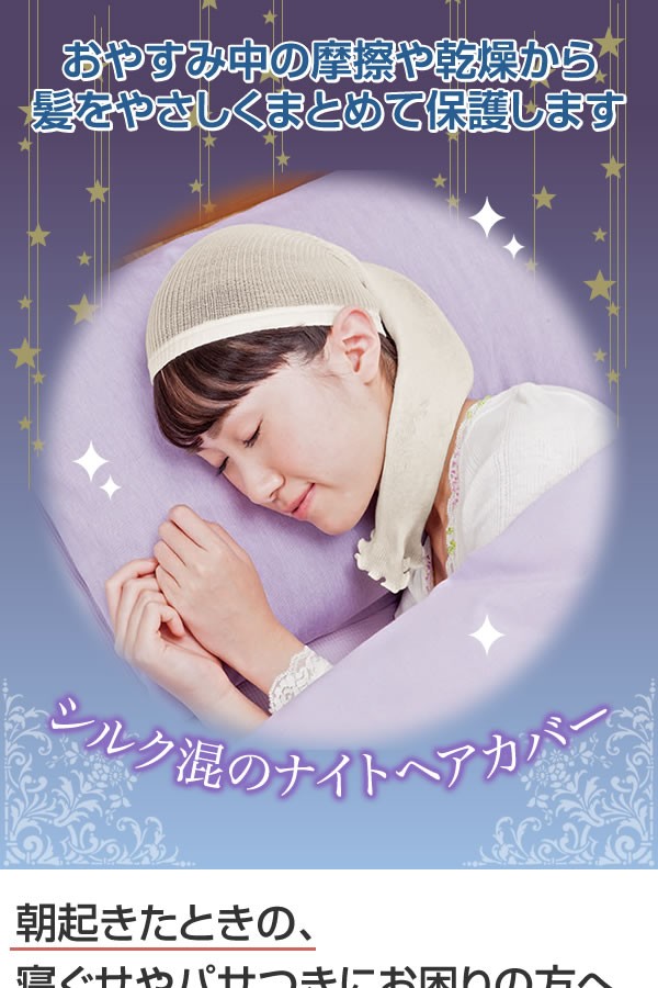 | <h1>寝返りによる摩擦や室内の乾燥など、ダメージを受けやすい就寝中の髪をやさしくまとめて保護するヘアカバー。高弾力・高伸縮の特殊機能ナイロン糸を内側に編み込んでおり、たっぷり伸びてロングヘアも包み込みます。頭囲には、締めつけず脱げにくい平ゴム入り。シルク/ヘアカバー/ヘアキャップ/髪/摩擦/寝ぐせ/傷み/予防/脱げにくい/ナイトキャップ/おやすみ</h1> |