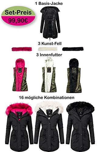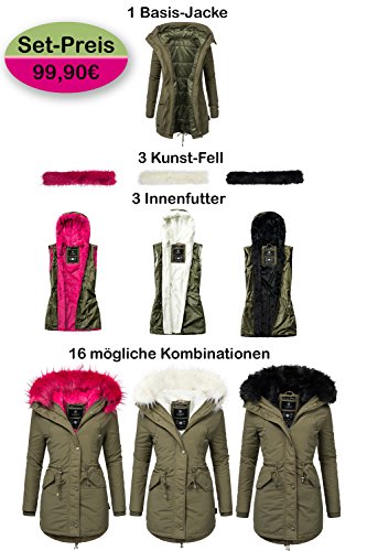 -. Binding : Textilien -. Brand : Marikoo -. Department : Damen -. Feature : Jacken-Set: Sie erwerben hier ein komplettes Set aus 1 Jacke mit 3 Kunstfellen und 3 Innenfutter, daraus ergeben sich 16 Variationsmöglichkeiten / Multicolor Style: Je nach Belieben können Sie den Kunstpelz an der Kapuze und das Innenfutter (jeweils in den Farben pink, weiß und schwarz) austauschen / Leicht austauschbar: Kunstpelz und Innenfutter (extra weich) mit durchgängigem Reißverschluss befestigt (rutscht nicht) / Sehr warm: Basisjacke kann auch ohne die Teddy Innenjacke getragen werden, durch das softe gesteppte Innenfutter der Basisjacke trotzdem sehr angenehm zu tragen (ideal für nicht ganz so kalte Tage) / Praktische Details: Taillenzugband für variable Form, gefütterte Außentaschen (gegen kalte Hände) -. ProductGroup : Apparel -. ProductTypeName : OUTERWEAR -. Title : Marikoo Tiramisu Damen Winterparka 1 Jacke 3 Farben 16 Kombinations-Möglichkeiten Mix & Match