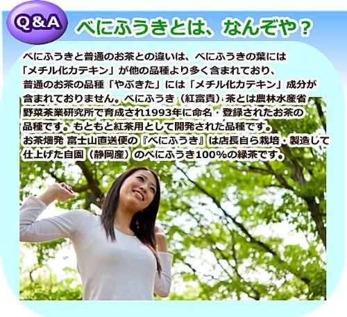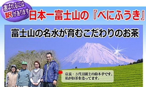 お茶畑発 富士山直送便の、べにふうき緑茶は店長自ら栽培・製造して仕上げた自園静岡産の、べにふうき100%の緑茶です。