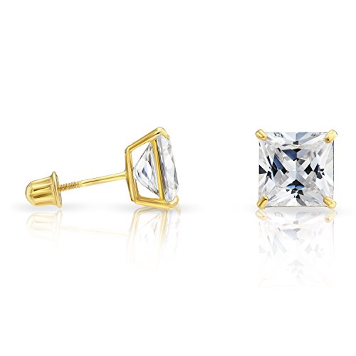 In a classic and sophisticated style, these 14k yellow gold stud earrings feature princess cut Cubic Zirconia stones in a four prong setting. Perfect to add a hint of sparkle to any look, the square shaped CZ stones are both timeless and elegant. The safety screw-backs prevents sharp poking of the post in the back of the ear and offers security to prevent loss of earrings by locking to the end of the post. This set is a universal piece of fine jewelry, and makes an ideal gift for any special occasion.Feature