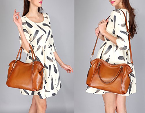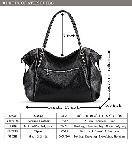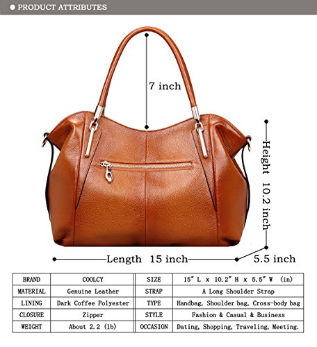 -. Feature : 100% PREMIUM QUALITY GENUINE LEATHER: This incomparably stylish women handbag is made of 100% finest quality, real leather that provides a luxury touch! In addition, the durable construction assures unmatched longevity. / ATTENTION GRABBING, VINTAGE, FASHIONABLE DESIGN: Forget about boring, ordinary purses that fail to make you stand out! This must have ladies handbag features a unique, striking, fashionable, vintage and classy style which is bound to make you the center of attention! / KEEP ALL YOUR THINGS NEATLY STORED: Stop wasting your time and feeling frustrated, trying to find your keys or cell phone in your bag! The Coolcy tote handbag for women features zipper pockets, an ID card slot and a 4.5'' x 6.8'' exterior zippered pocket which are ideal for keeping all your things perfectly organized! / ACCENTUATE YOUR PERSONAL STYLE: Every woman is unique! This leather purse can be worn in different ways, allowing you to match it with your own personal style! Cross it over your body to acquire a more casual style or wear it over your shoulder and look chic and sophisticated. / A MUST HAVE FOR EVERY WOMAN: Apart from making this leather tote handbag yours, you can also offer it as a gift on any occasion! Whether it is your wife's birthday, your daughter's graduation or your mother's name day, this ladies shoulder and cross body bag is the perfect present.