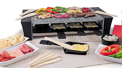 The Swissmar Ticino 8 Person Raclette Party Grill with Granite Stone is perfect for the indoor Raclette party. Raclette is a time-honored Swiss tradition of melting cheese to the perfect softness for scraping across bread or meats, but with this Ticino Raclette Party Grill, you can also grill meats, mushrooms, vegetables and seafood to perfection. Made of high quality steel and sturdy, hygienic granite, this beautiful grill will be the centerpiece of your party. It comes with 8 wooden spatulas for moving and turn the meats and vegetables on the granite top or for scraping the softened cheese across bread. There are 8 non-stick Raclette dishes for melting cheese. There is variable heat control so that you can set the grill to your desired cooking temperature. Uses 1200 watts/120V/60 Hz.Feature