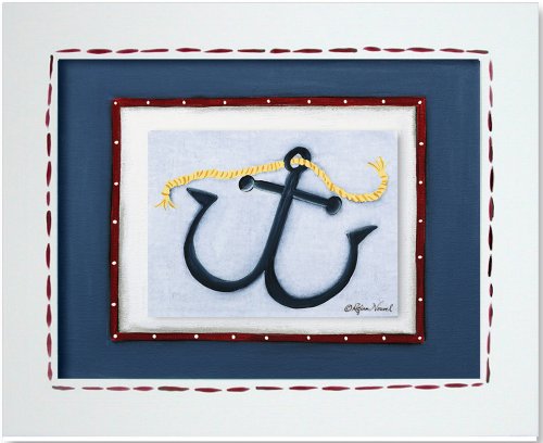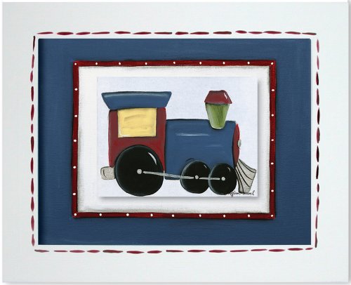 Choo Choo Trains never go out of style. This engine is blue, red and green and is mounted on a Navy Blue and Red background. The Doodlefish Double Mount concept features a 6" x 8" print that is mounted atop a larger background piece. The artwork is then framed in a white frame with coordinating hand-painted details. The finished size is approximately 17.5" x 14.5".