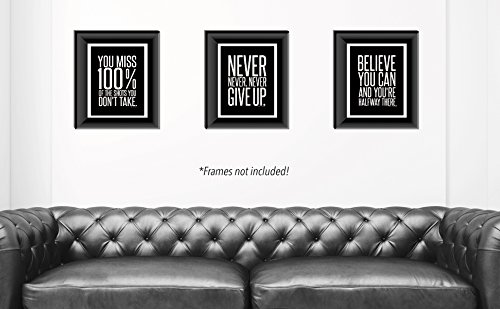 -. Feature : MOTIVATIONAL WALL ART: Our posters provide daily inspiration and are the perfect choice for the office, dorm room, classroom, home, gym. They are great for entrepreneurs, kids, teens, girls, babies, athletic teams. / SET OF 3 POSTERS: Each set includes a total of three black and white typographic quote posters. / READY TO FRAME: These 8 x 10" posters are P.R.Inted on 100# gloss book and are ready to be placed in a frame. / MADE & ASSEMBLED BY HAND IN THE USA: We proudly design, P.R.Int and assemble all of our products in the USA. / GREAT GIFT IDEA: This set of motivational posters makes an excellent gift idea for just about anyone including new business owners, those going off to college or those who are just beginning their careers.