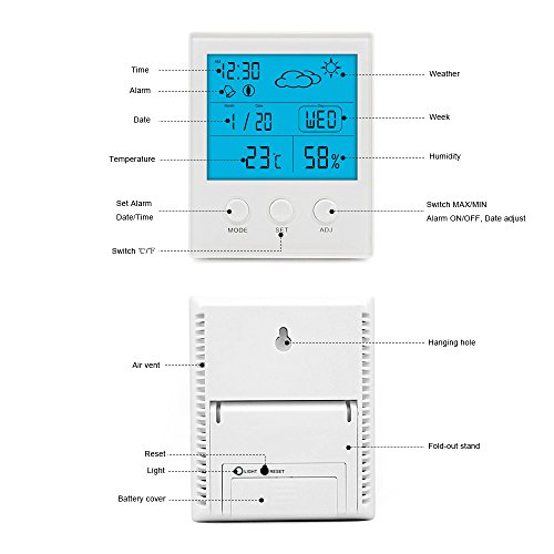 - 【Multiple Functional Monitor】-- Work as hygrometer, thermometer, alarm, calendar, week, weather conditions ect.